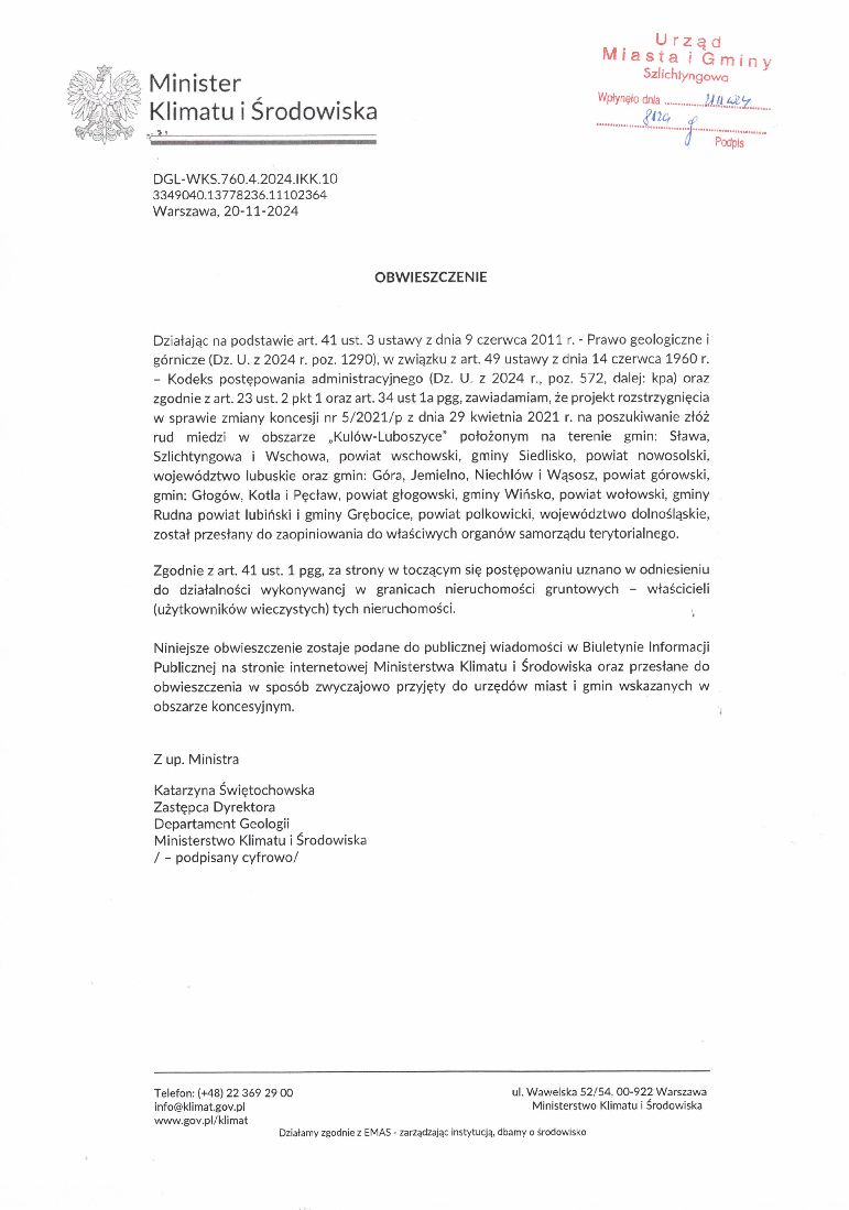 Obwieszczenie Ministra Klimatu i Środowiska znak: DGL-WKS.760.4.2024.lKK.10 z dnia 20.11.2024 r. (data wpływu do tut. organu 21.11.2024 r.) w sprawie zmiany koncesji nr 5/2021/p z dnia 29 kwietnia 2021 r. na poszukiwanie złóż rud miedzi w obszarze „Kulów-Luboszyce” położonym na terenie gmin: Sława, Szlichtyngowa i Wschowa, powiat wschowski, gminy Siedlisko, powiat nowosolski, województwo lubuskie oraz gmin: Góra, Jemielno, Niechlów i Wąsosz, powiat górowski, gmin: Głogów, Kotla i Pęcław, powiat głogowski, gminy Wińsko, powiat wołowski, gminy Rudna powiat lubiński i gminy Grębocice, powiat polkowicki, województwo dolnośląskie, który został przesłany do właściwych urzędów miast i gmin celem podania do publicznej wiadomości w sposób zwyczajowo przyjęty.