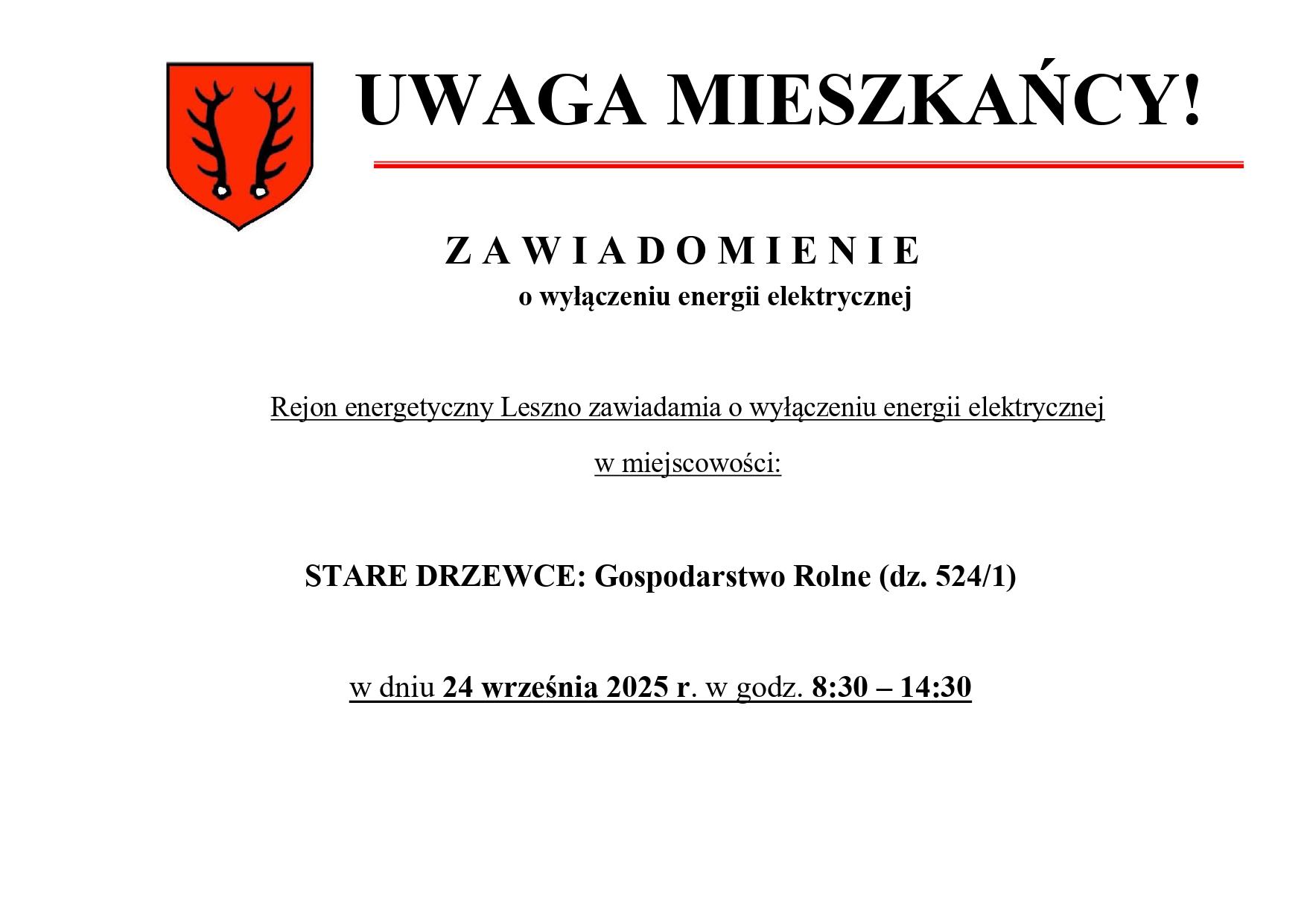 Zawiadomienie o wyłączeniu energii elektrycznej w Starych Drzewcach