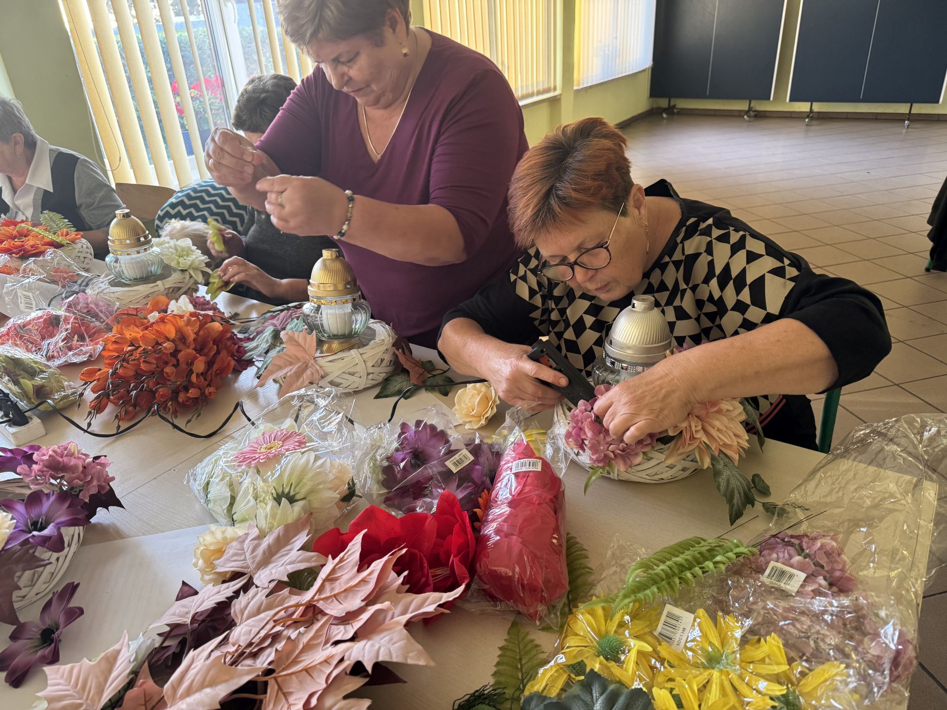 Aktywności w Klubie Senior w Zamysłowie. Ze względu na zbliżający się Dzień Wszystkich Świętych nasi Seniorzy ostatni wtorek spędzili na warsztatach artystycznych, na których wykonali przepiękne stroiki, które przyozdobią groby ich najbliższych.